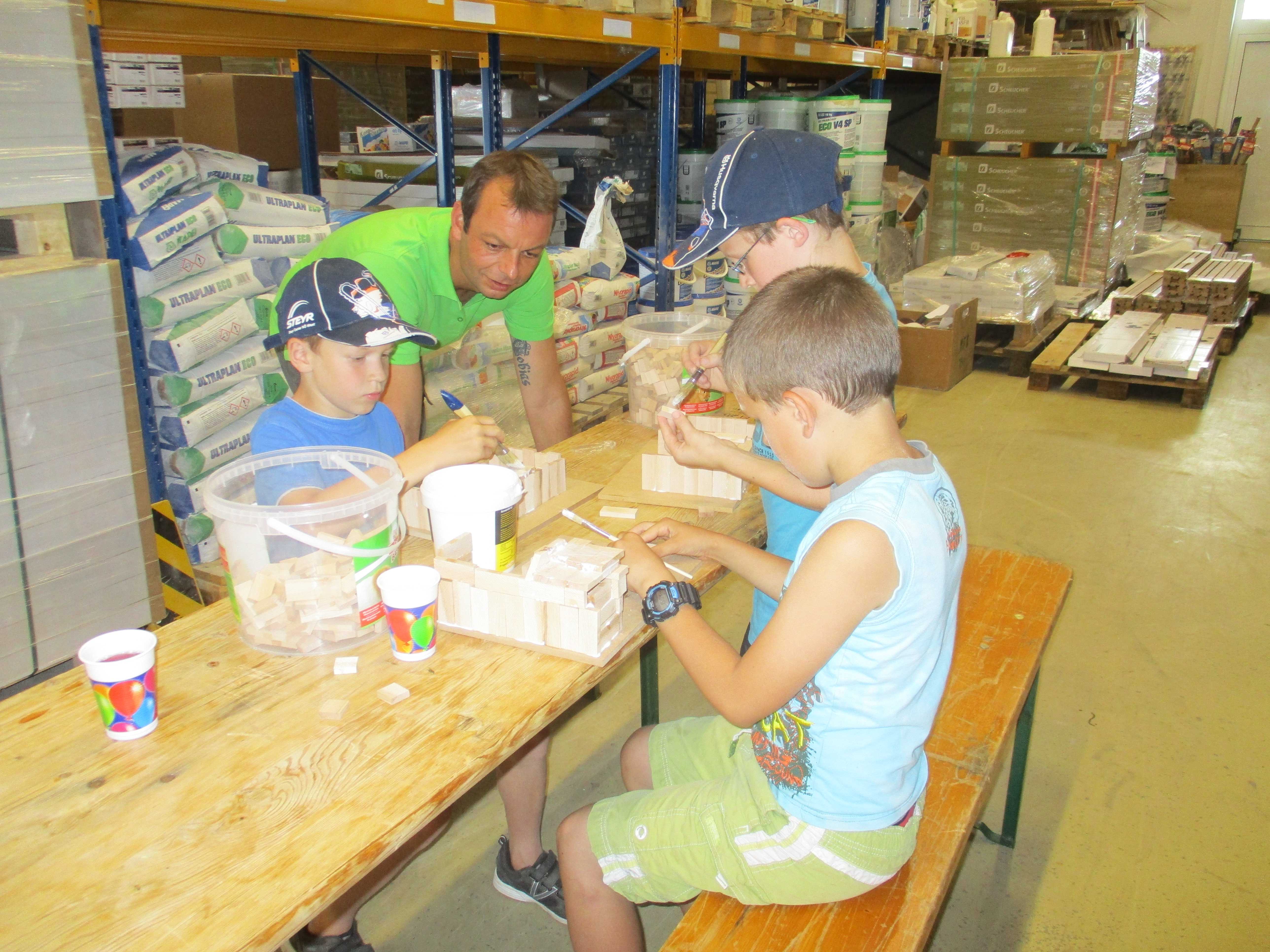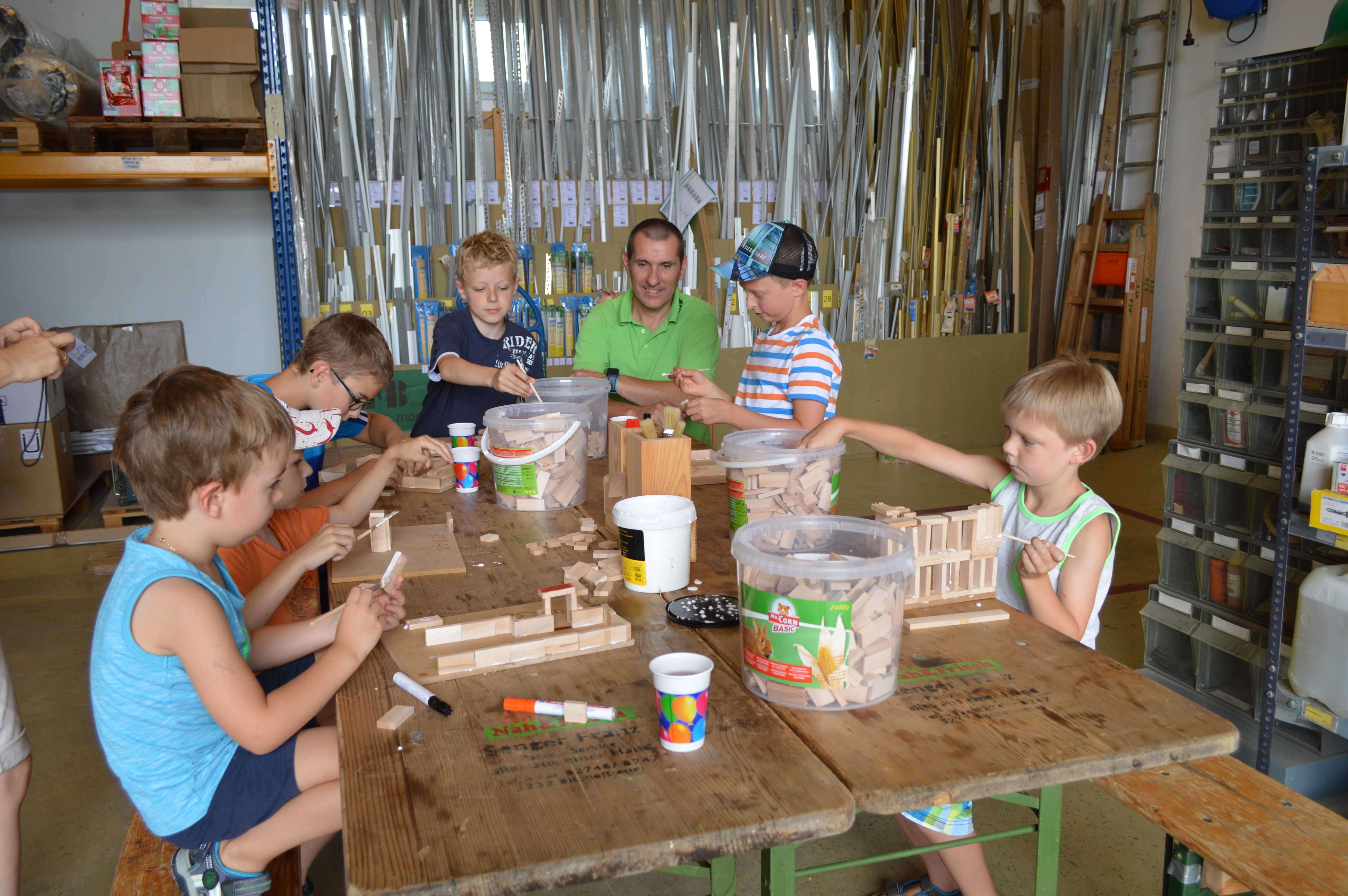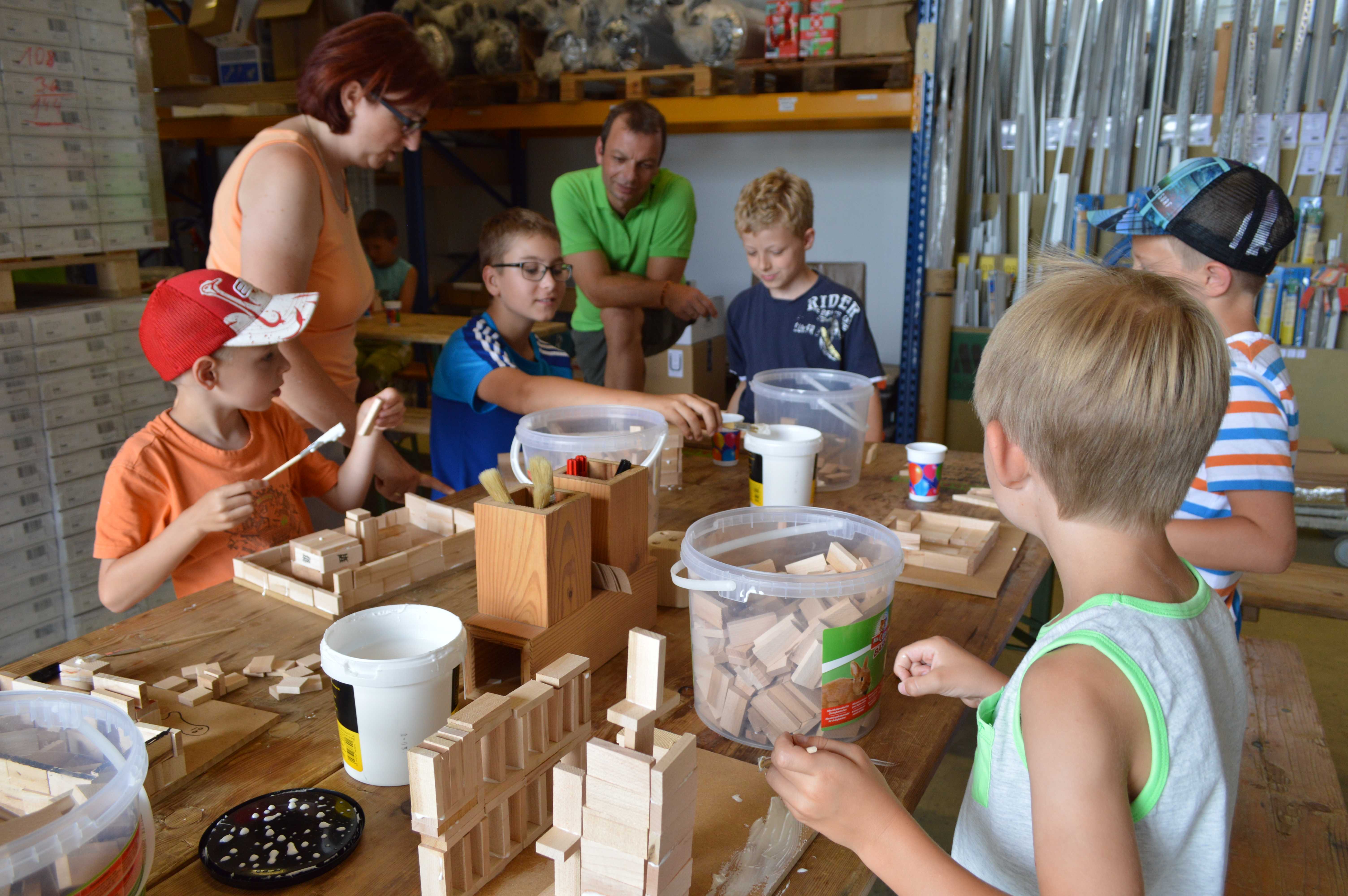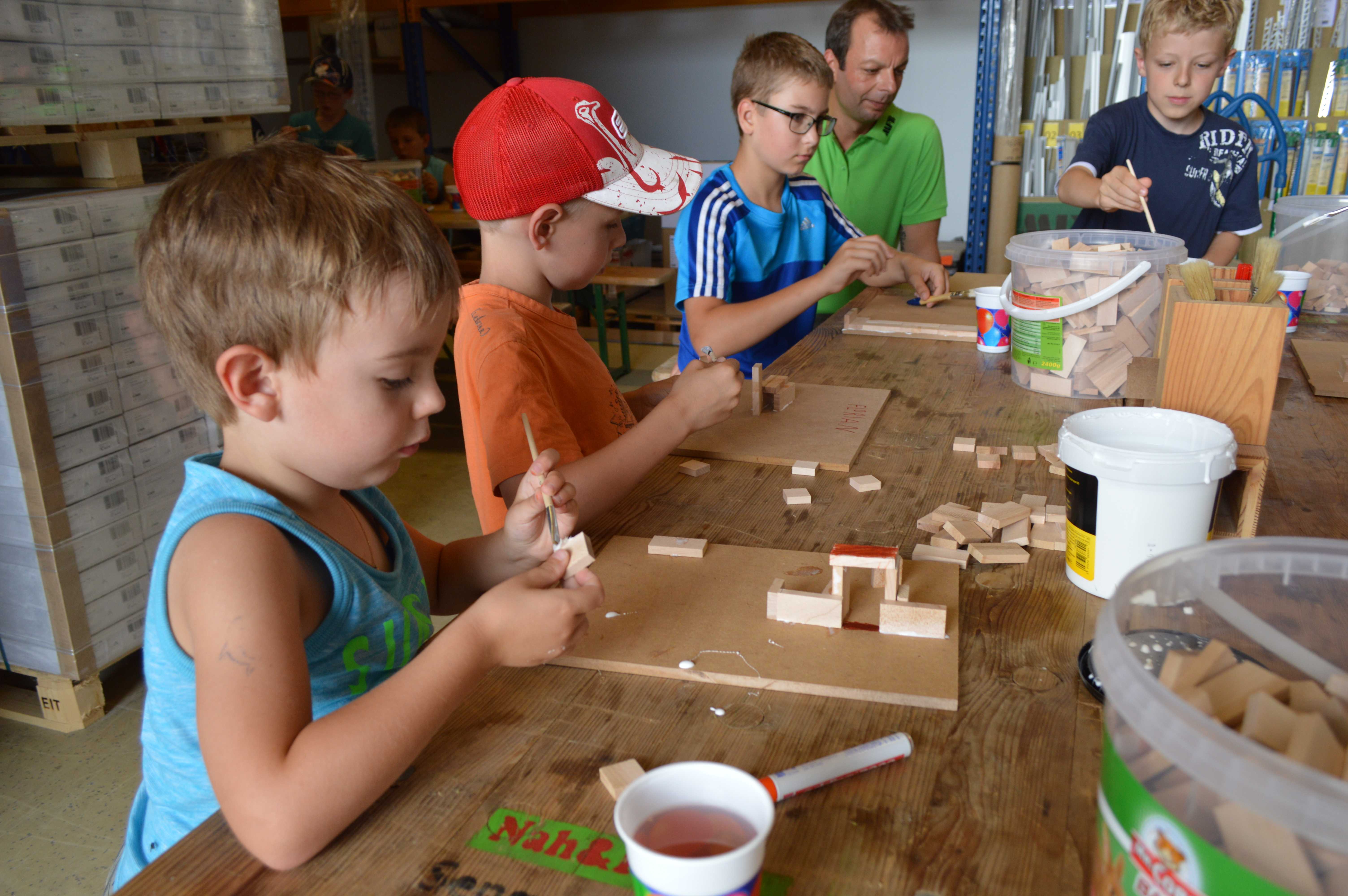 Begeistert waren die Kinder vom Betrieb MF-Böden. Dort wurden aus Parkettbodenblättchen, Industrieparkett Stäbchen und Leim richtig tolle Bauwerke gestaltet. Die Kinder durften sich kreativ entfalten, angefangen von Maschinenhallen bis zu Gefängnissen und Kirchen - hier wurde viel experimentiert. Unterstützung und Ratschläge zur Statik der Bauwerke gab es für die Kids vom Chef Manfred Maier-Fuchs persönlich und von den Mitarbeitern von MF-Böden.