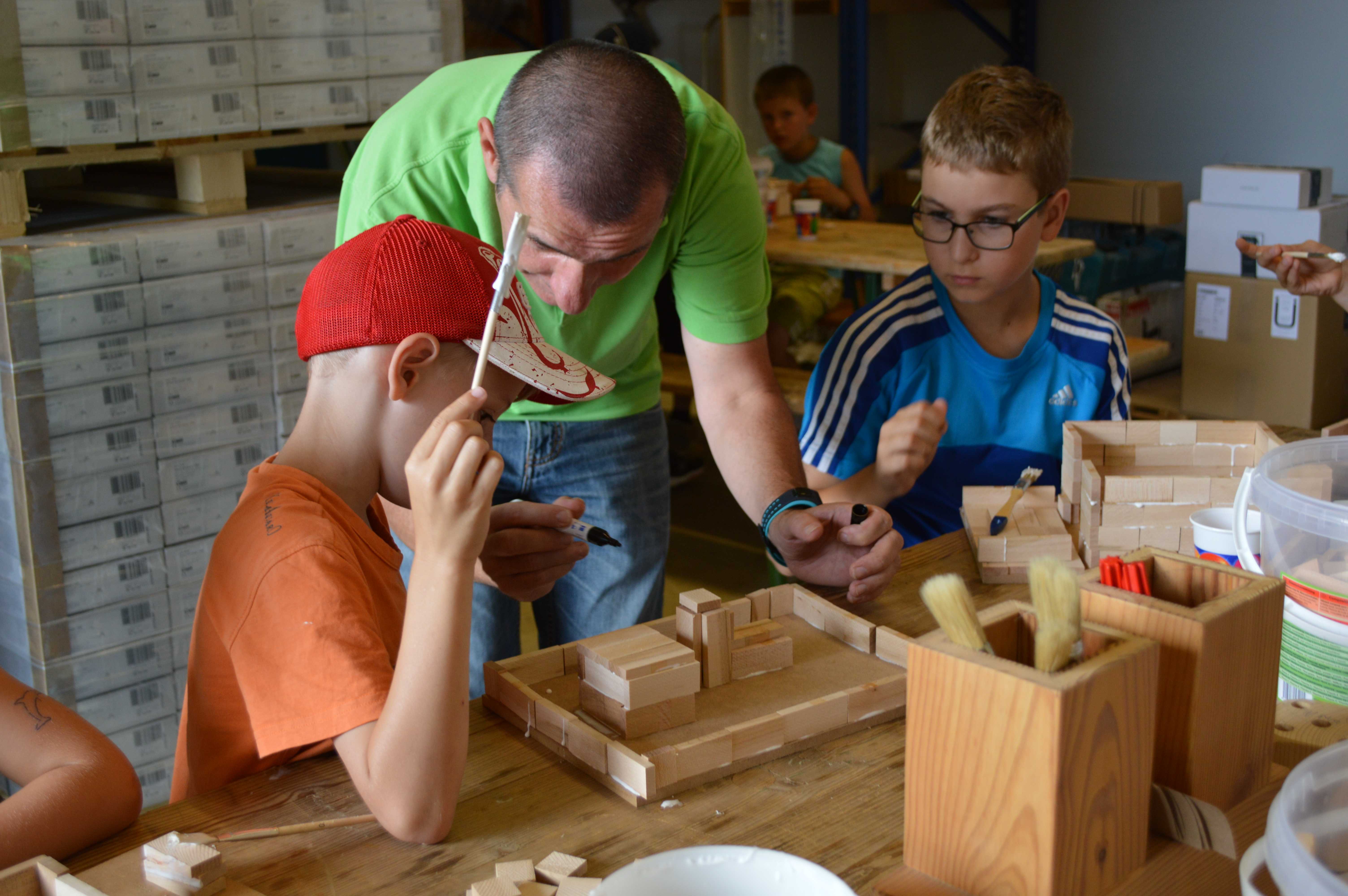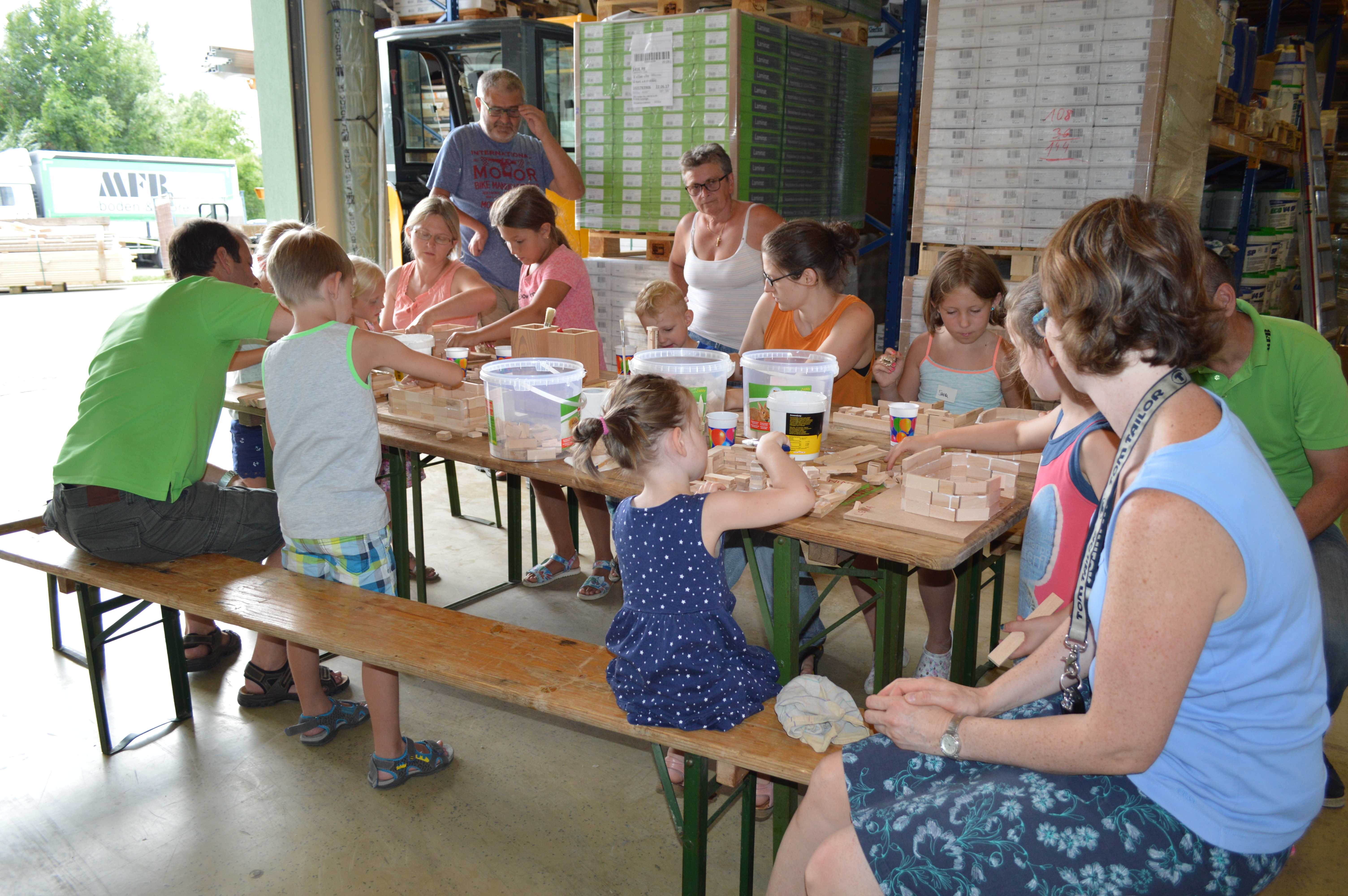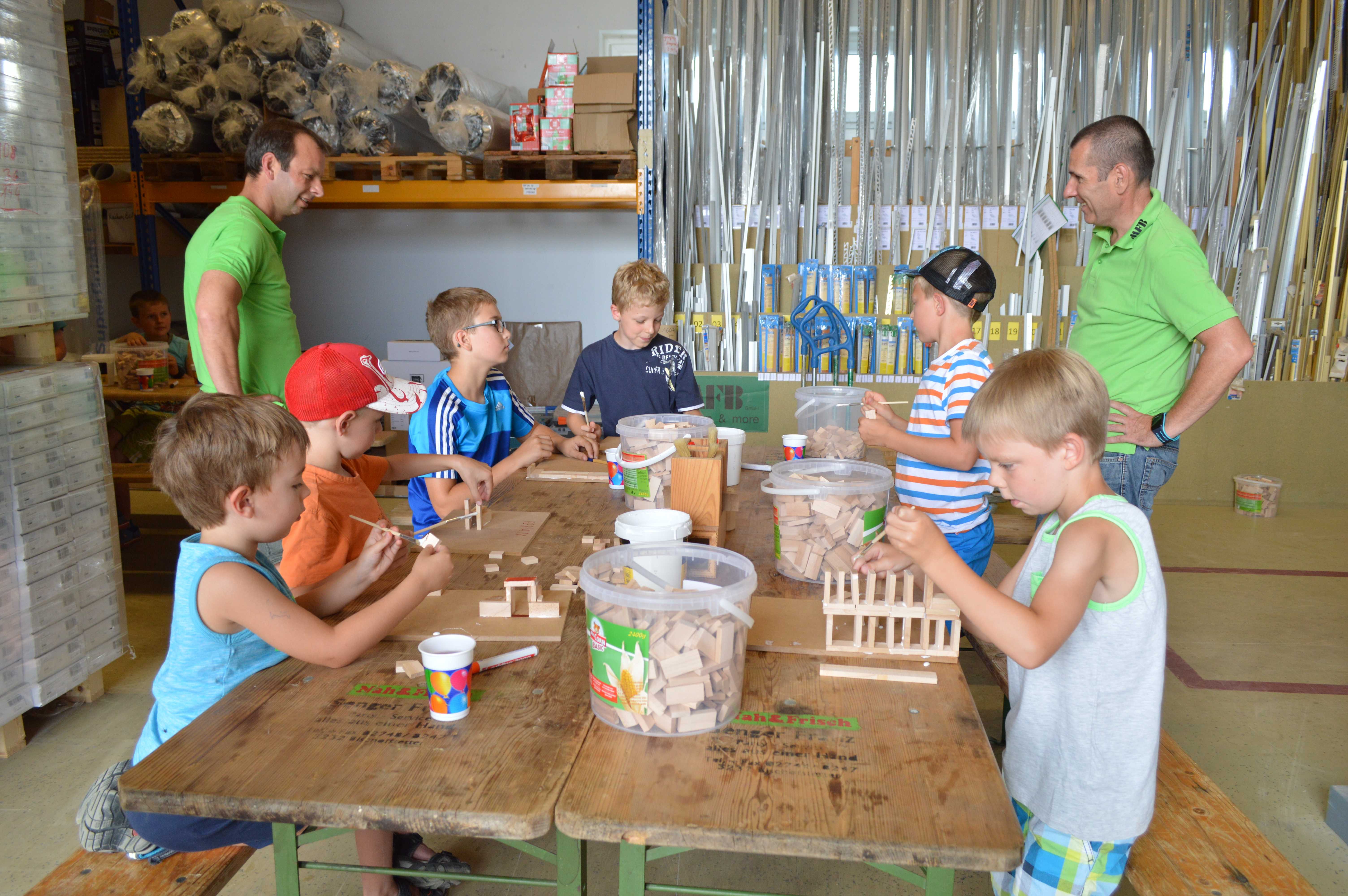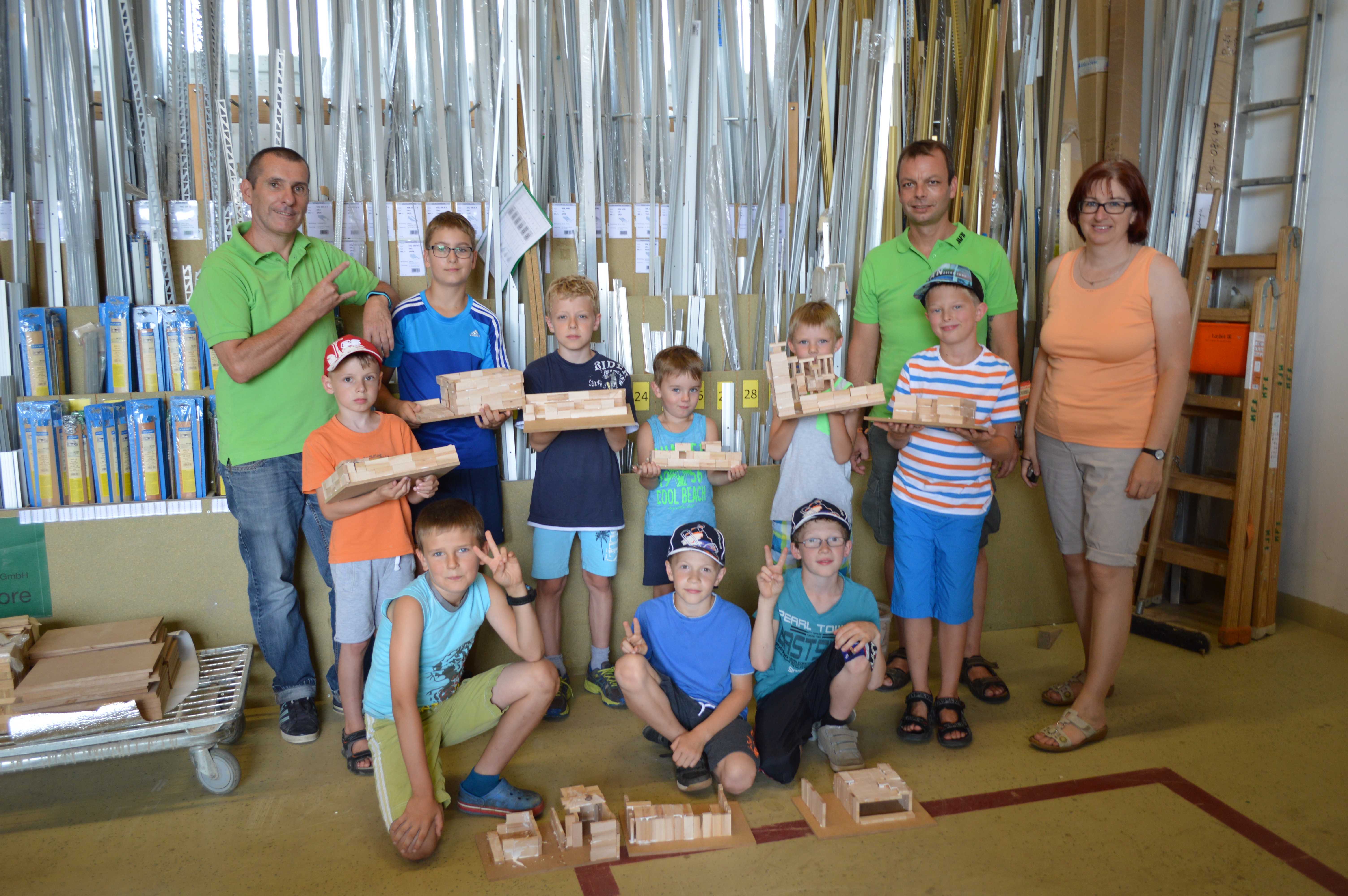 Begeistert waren die Kinder vom Betrieb MF-Böden. Dort wurden aus Parkettbodenblättchen, Industrieparkett Stäbchen und Leim richtig tolle Bauwerke gestaltet. Die Kinder durften sich kreativ entfalten, angefangen von Maschinenhallen bis zu Gefängnissen und Kirchen - hier wurde viel experimentiert. Unterstützung und Ratschläge zur Statik der Bauwerke gab es für die Kids vom Chef Manfred Maier-Fuchs persönlich und von den Mitarbeitern von MF-Böden.