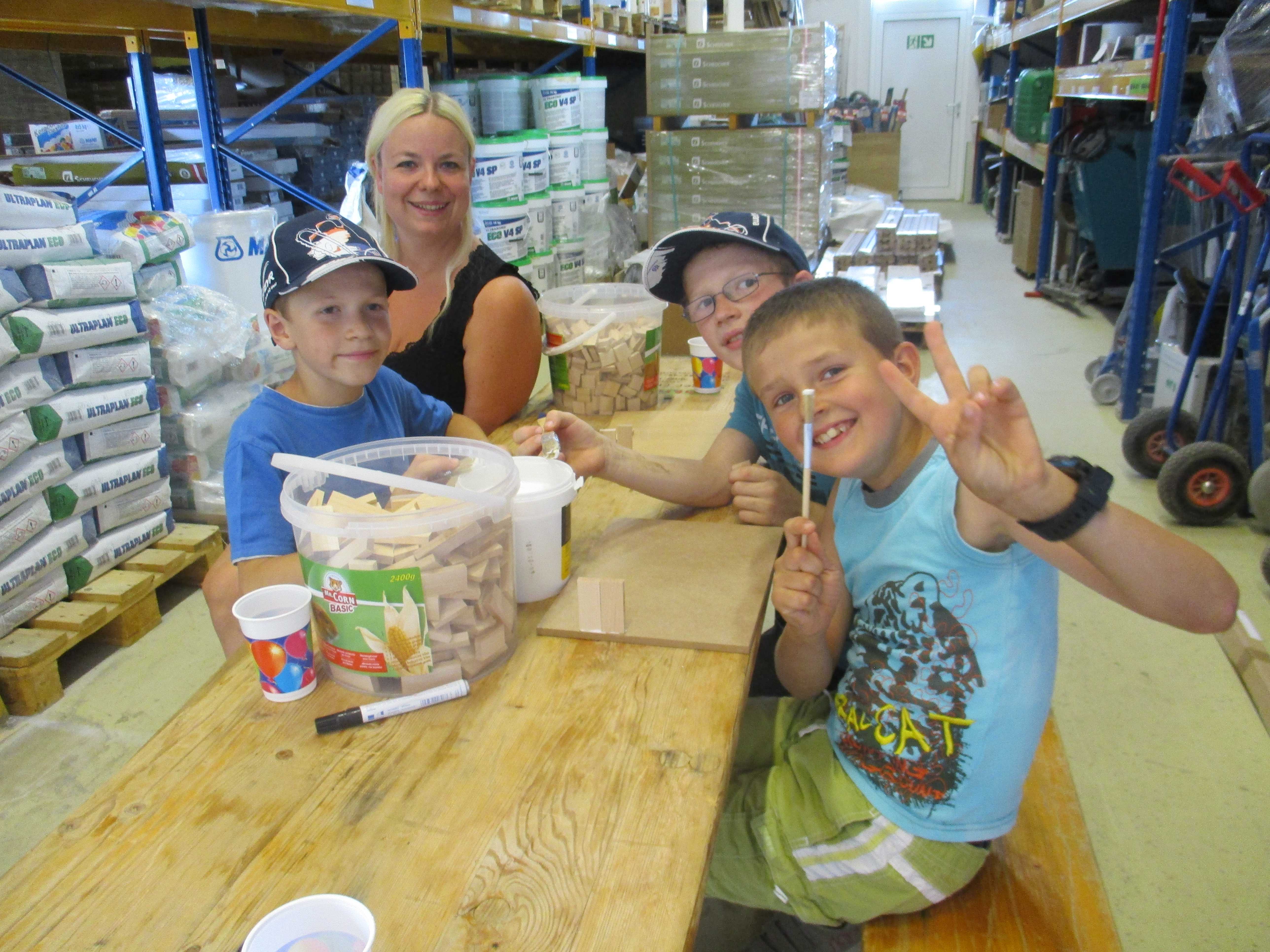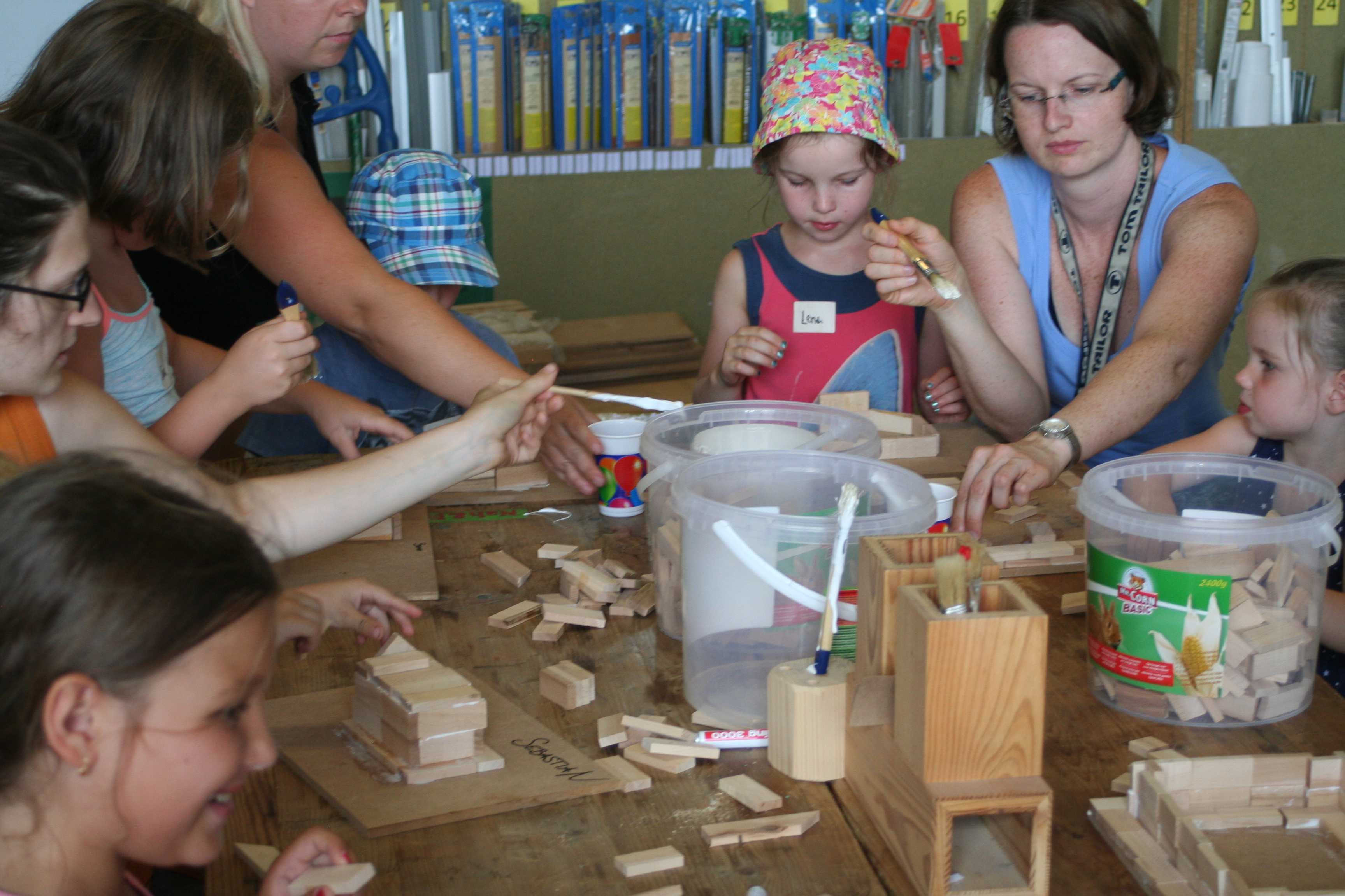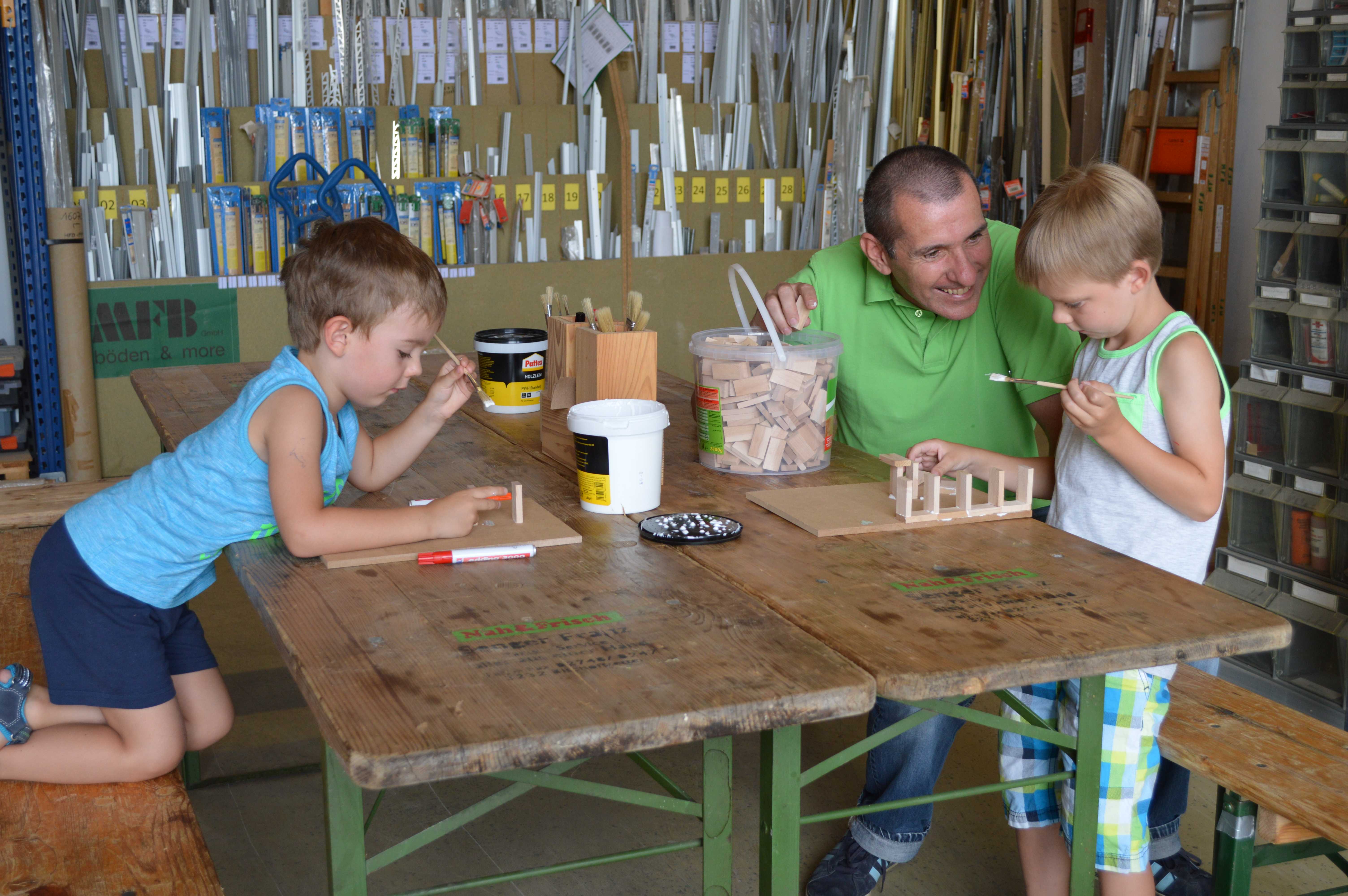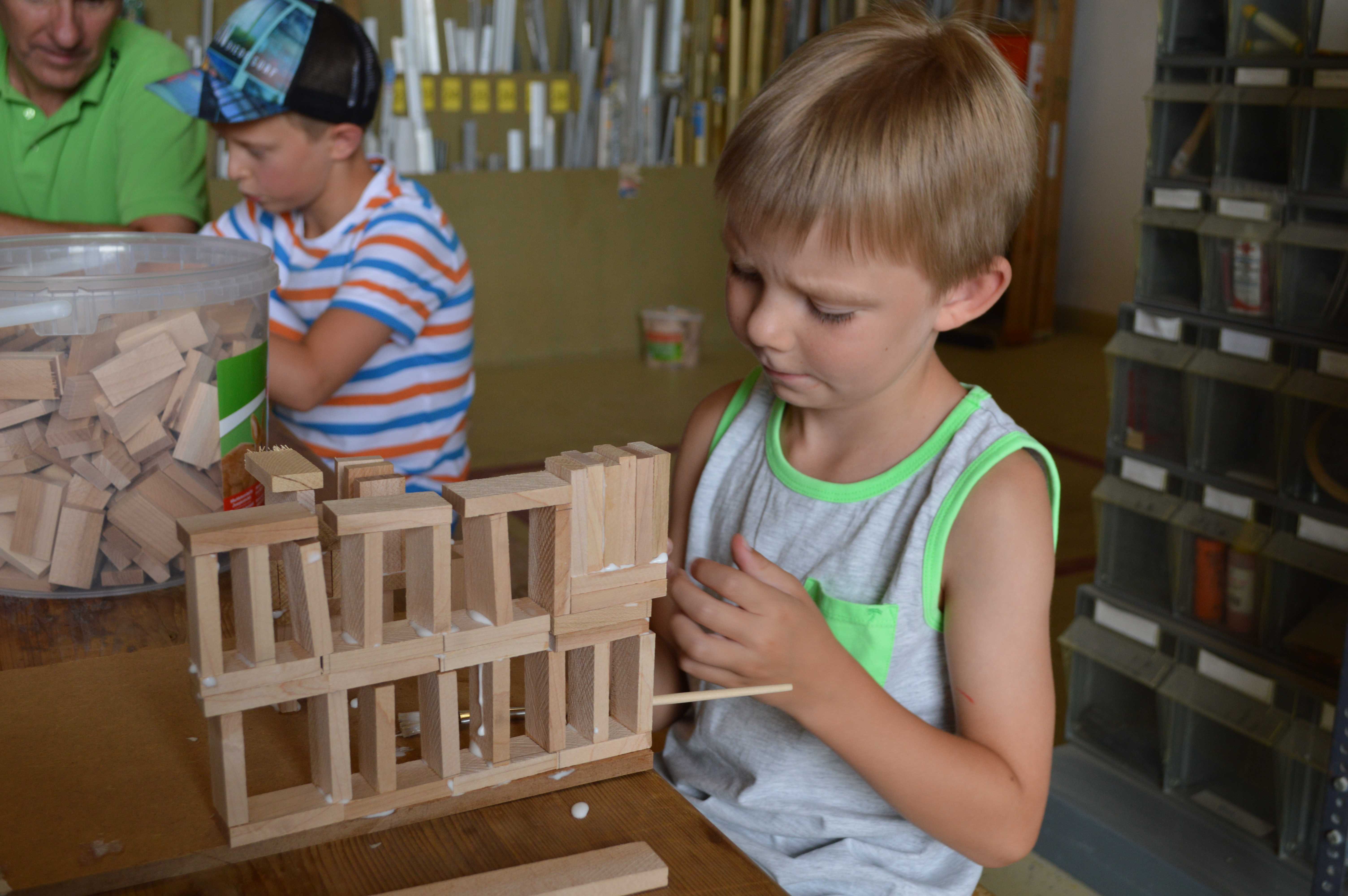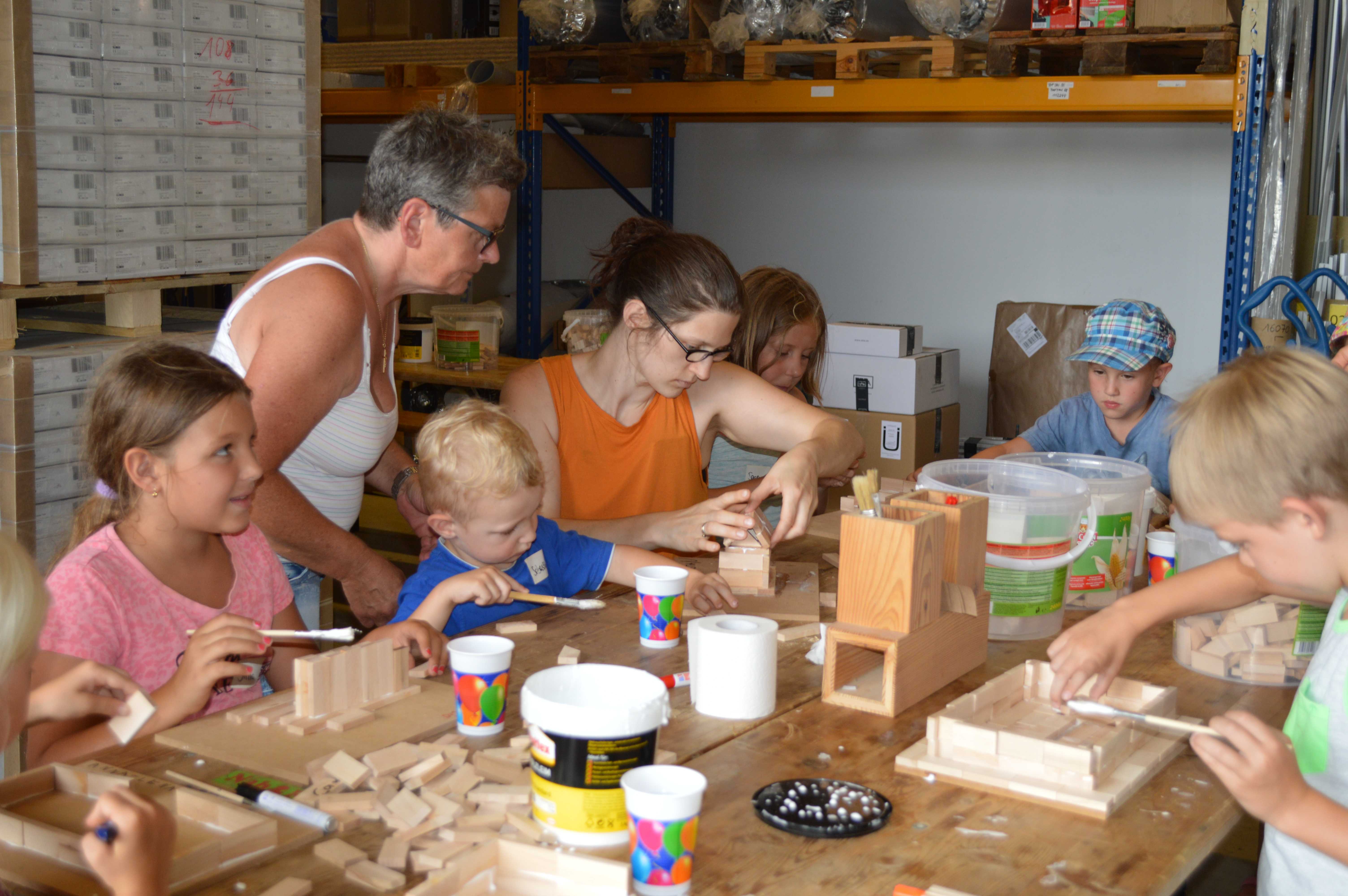 Begeistert waren die Kinder vom Betrieb MF-Böden. Dort wurden aus Parkettbodenblättchen, Industrieparkett Stäbchen und Leim richtig tolle Bauwerke gestaltet. Die Kinder durften sich kreativ entfalten, angefangen von Maschinenhallen bis zu Gefängnissen und Kirchen - hier wurde viel experimentiert. Unterstützung und Ratschläge zur Statik der Bauwerke gab es für die Kids vom Chef Manfred Maier-Fuchs persönlich und von den Mitarbeitern von MF-Böden.