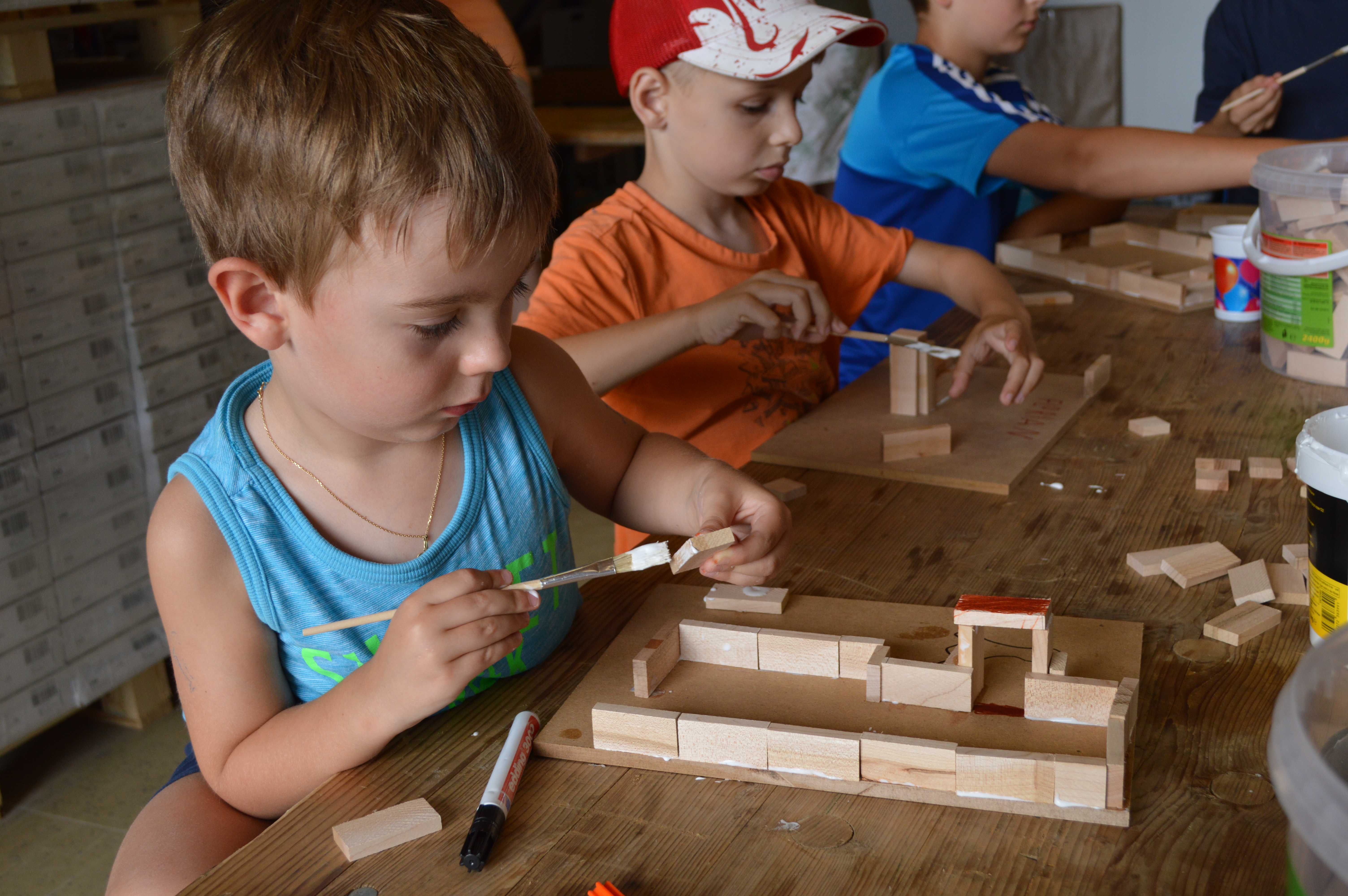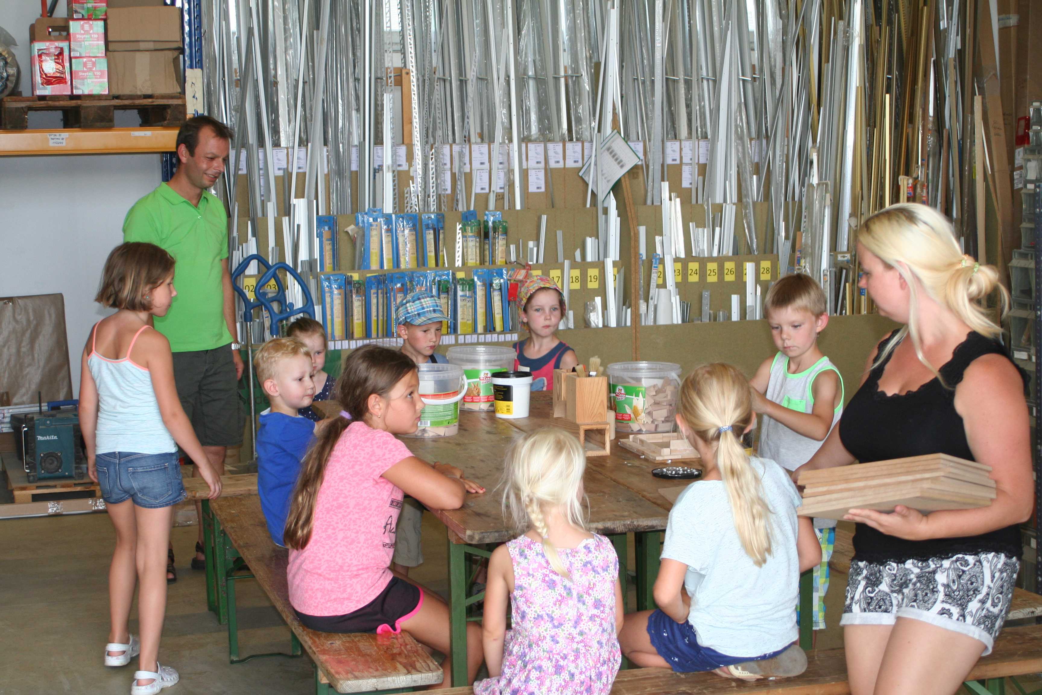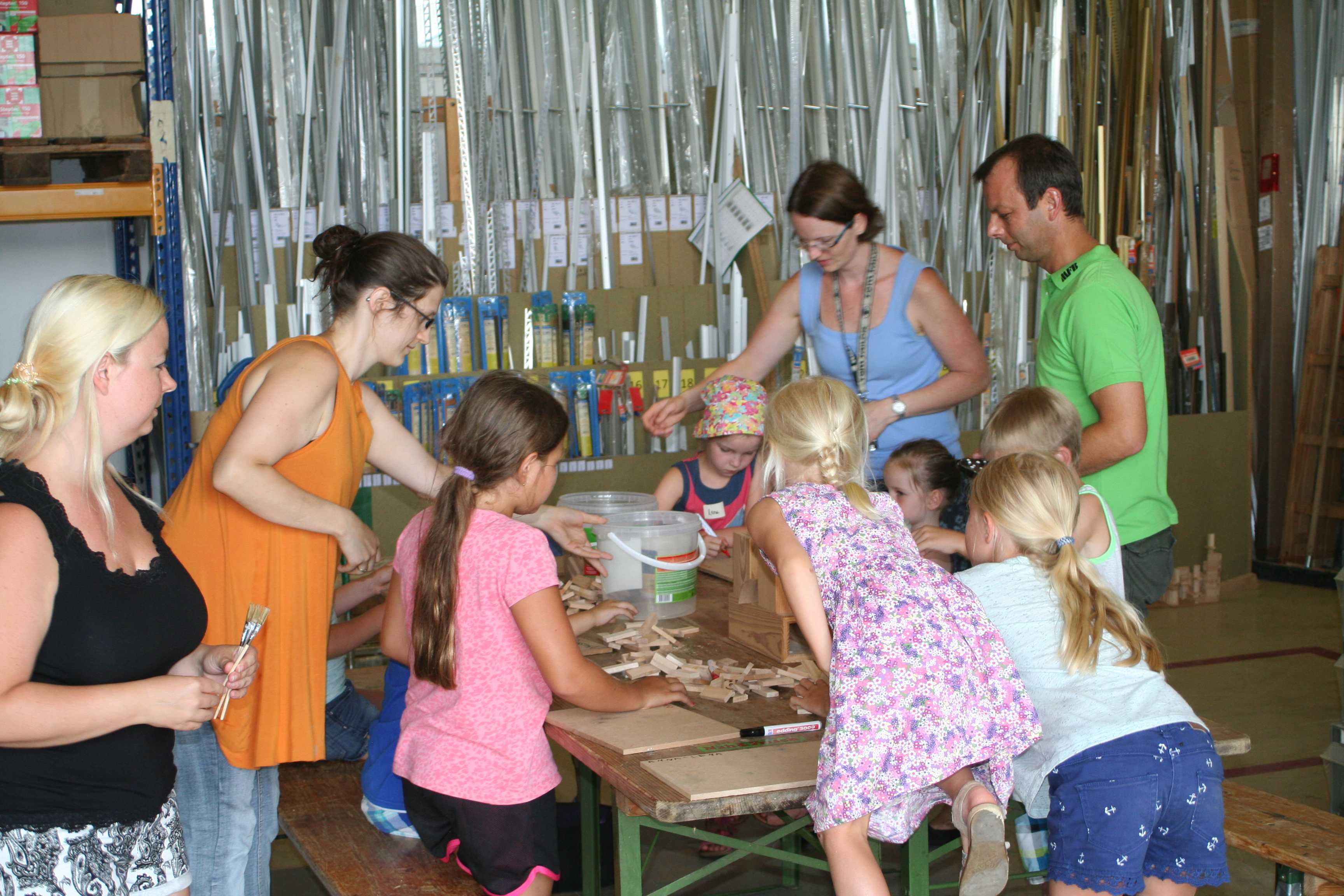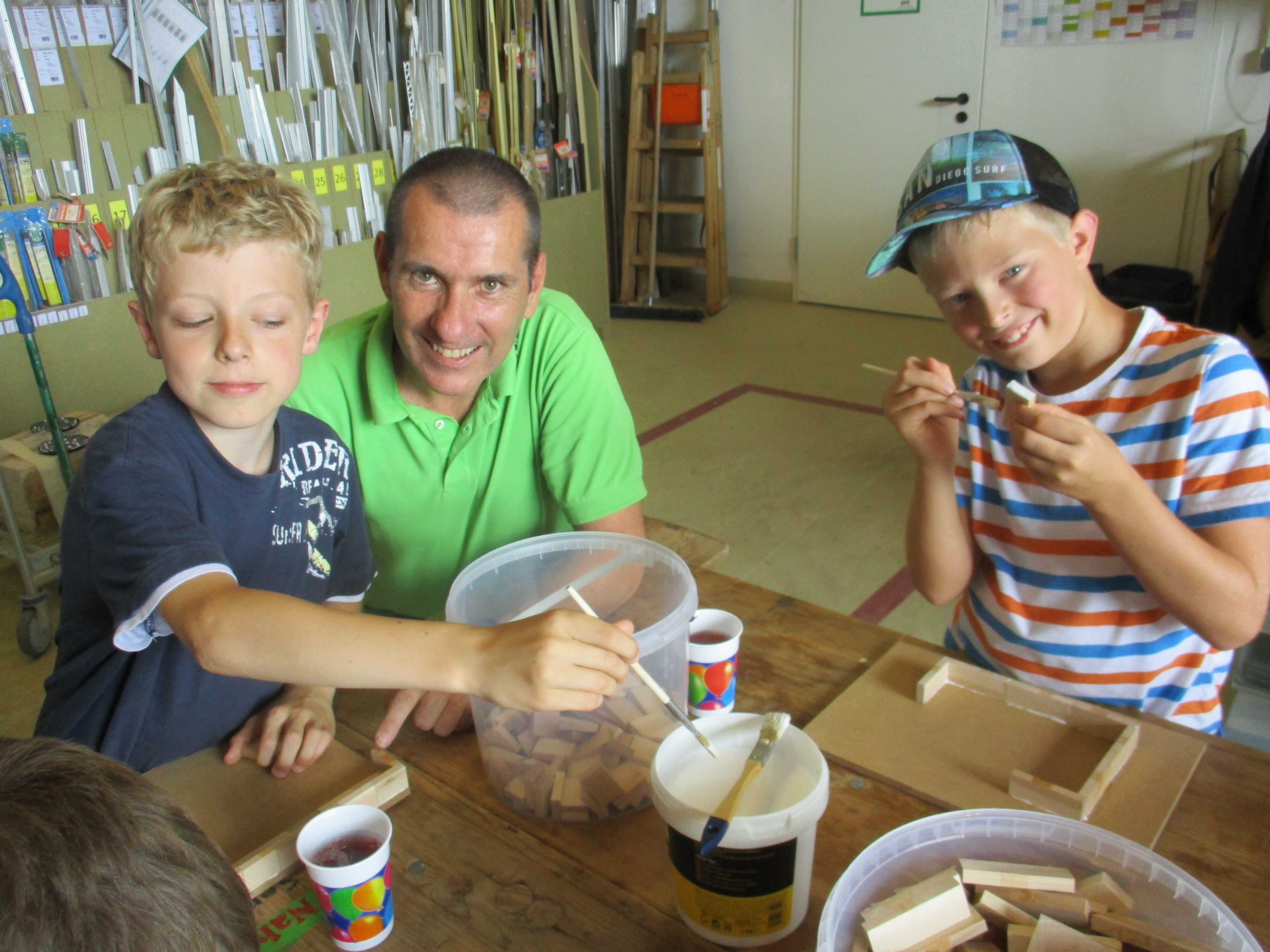 Begeistert waren die Kinder vom Betrieb MF-Böden. Dort wurden aus Parkettbodenblättchen, Industrieparkett Stäbchen und Leim richtig tolle Bauwerke gestaltet. Die Kinder durften sich kreativ entfalten, angefangen von Maschinenhallen bis zu Gefängnissen und Kirchen - hier wurde viel experimentiert. Unterstützung und Ratschläge zur Statik der Bauwerke gab es für die Kids vom Chef Manfred Maier-Fuchs persönlich und von den Mitarbeitern von MF-Böden.