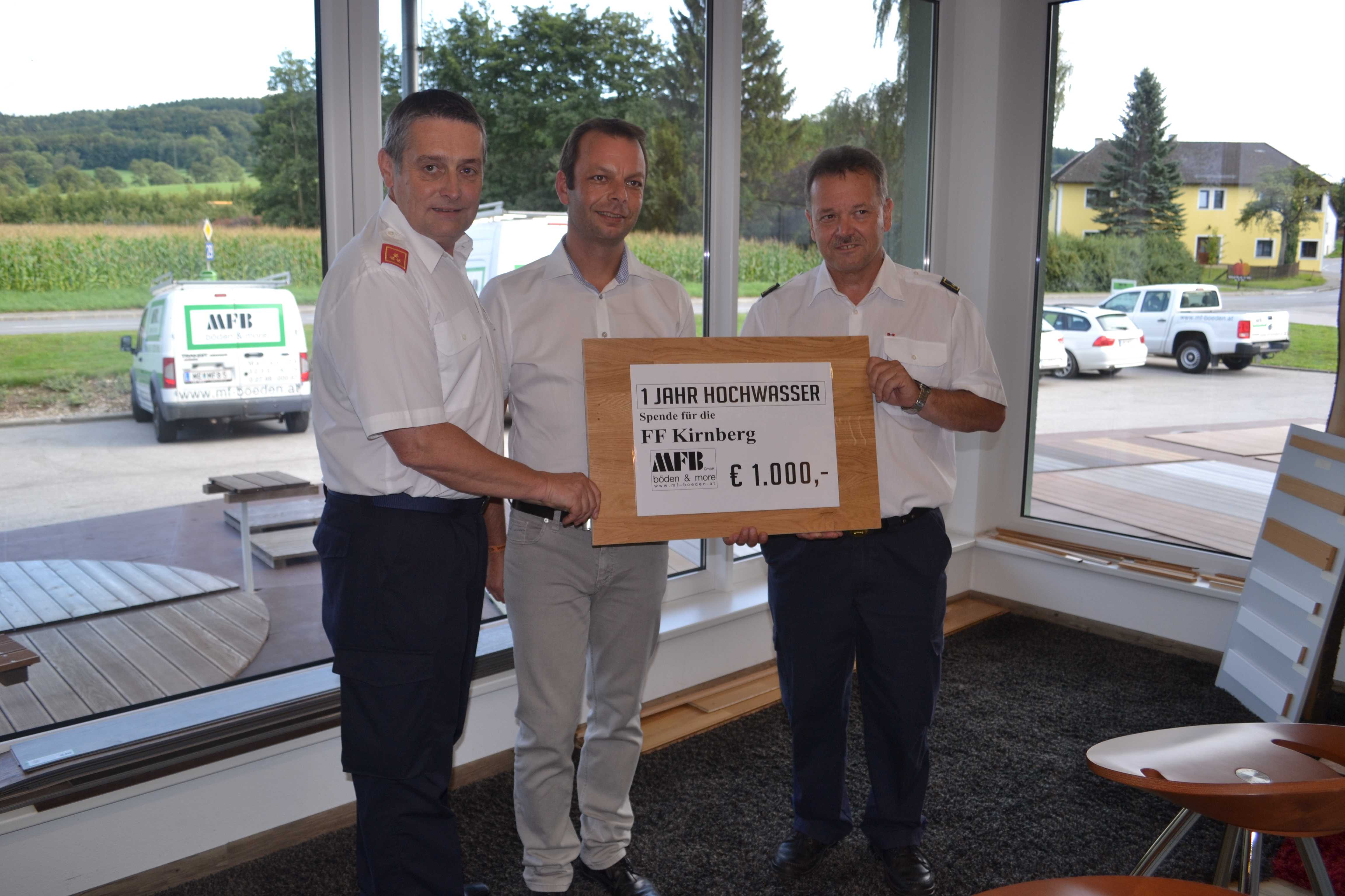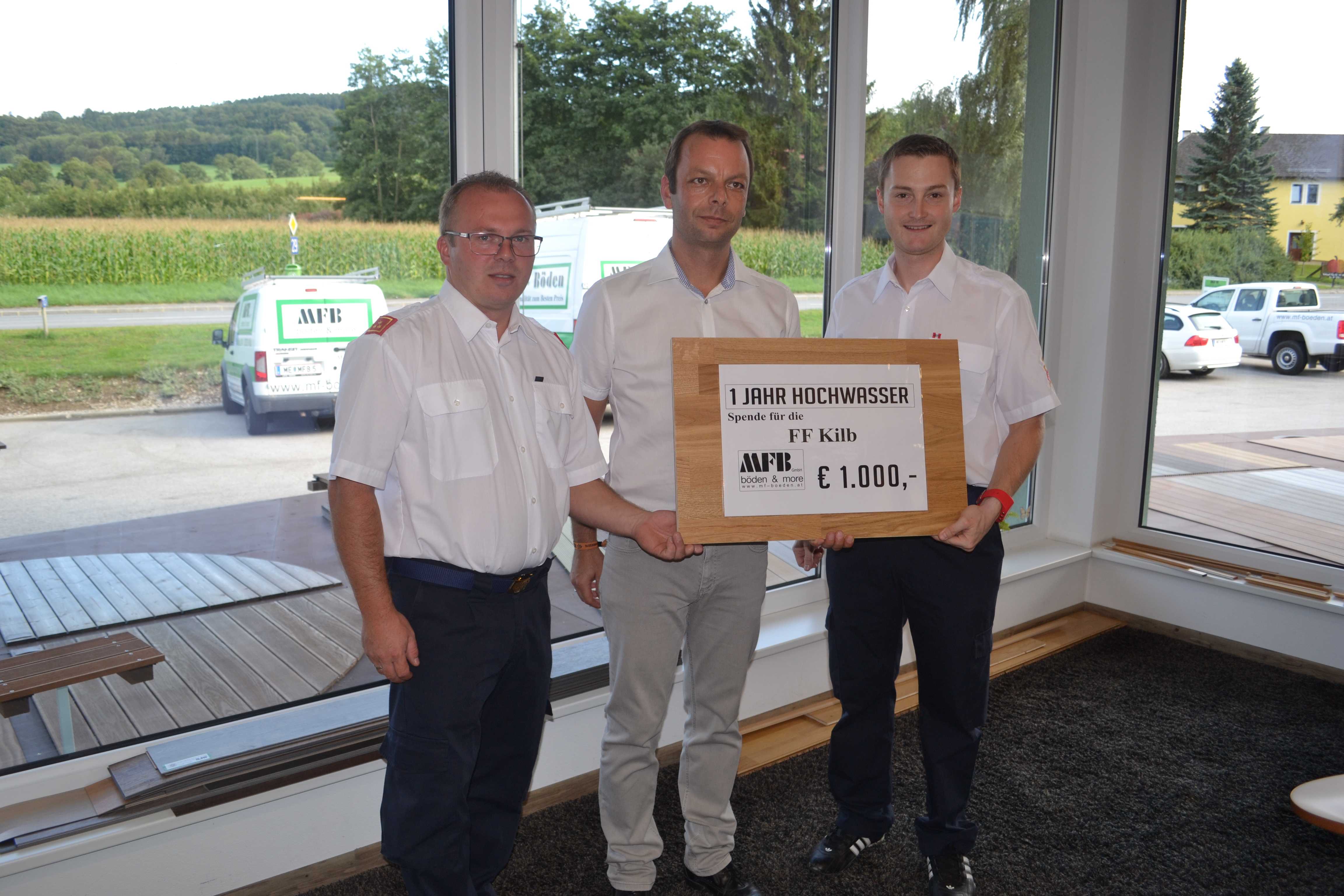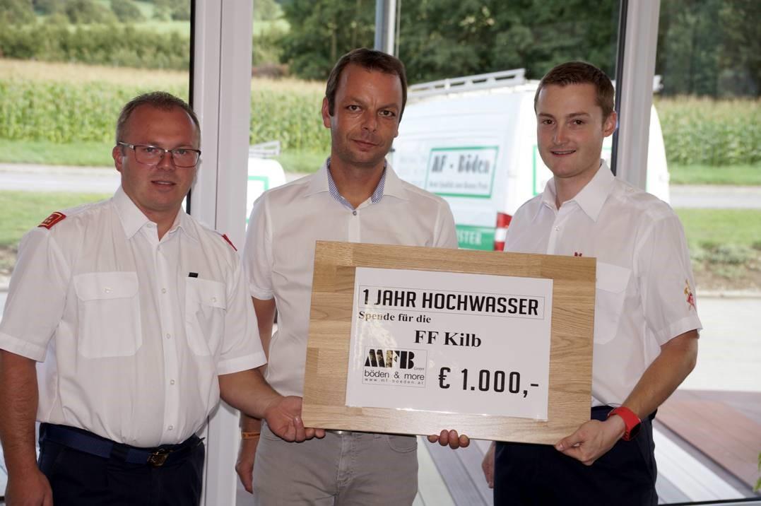 Neben den Mitarbeitern der Firma MFB und Helfern aus der Familie haben sich die Freiwilligen Feuerwehren Kilb, Kirnberg und Krummnußbaum besonders rasch um die Beseitigung des Wassers und des Schlammes bemüht. „Aus diesem Grund ist es mir ein besonderes Anliegen den Freiwilligen Feuerwehren mit einer Spende von je € 1.000,- meinen nochmaligen Dank auszusprechen!“, sagt der Herr Maier-Fuchs bei der Übergabe der Spenden. „Es ist schön zu wissen, dass die Arbeit der vielen Freiwilligen auch nach einem Jahr noch gewürdigt wird. Vielen Dank an Herrn Maier-Fuchs im Namen der 3 Feuerwehren.“, meint der sichtlich ergriffene Feuerwehrkommandant von Kilb Pitzl Jürgen.