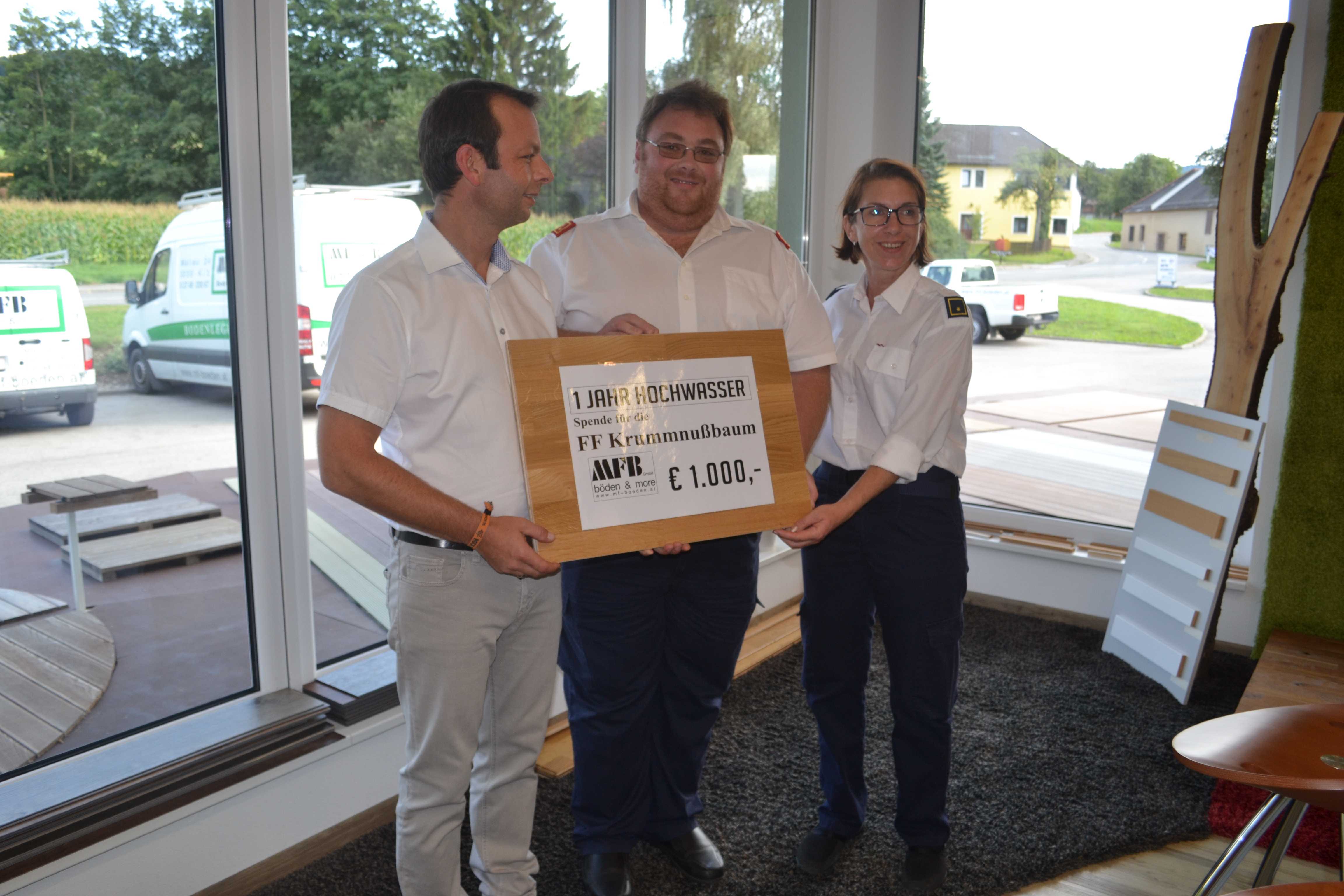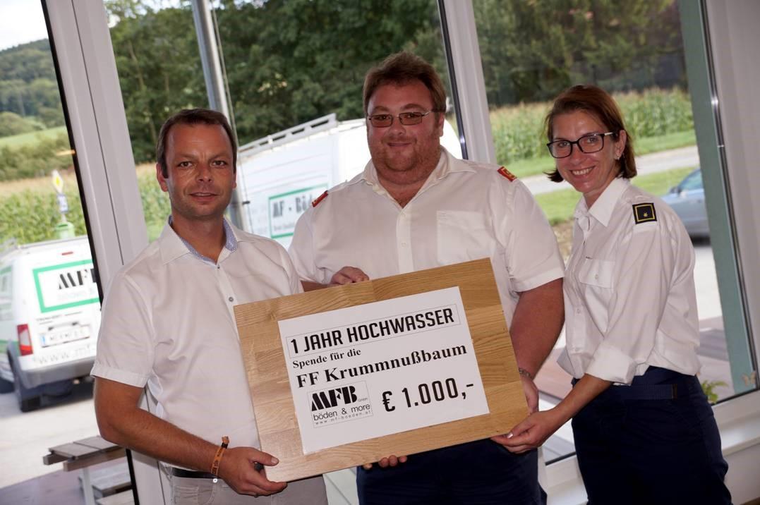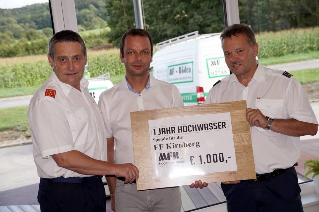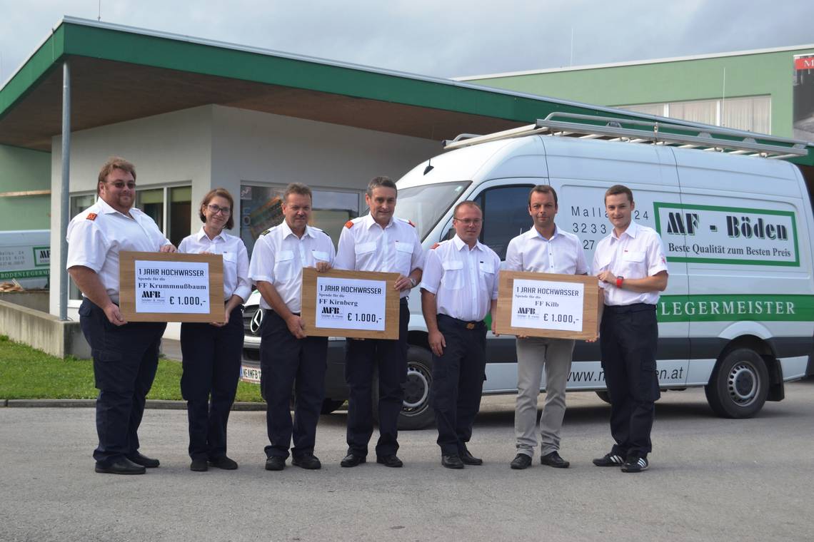 Neben den Mitarbeitern der Firma MFB und Helfern aus der Familie haben sich die Freiwilligen Feuerwehren Kilb, Kirnberg und Krummnußbaum besonders rasch um die Beseitigung des Wassers und des Schlammes bemüht. „Aus diesem Grund ist es mir ein besonderes Anliegen den Freiwilligen Feuerwehren mit einer Spende von je € 1.000,- meinen nochmaligen Dank auszusprechen!“, sagt der Herr Maier-Fuchs bei der Übergabe der Spenden. „Es ist schön zu wissen, dass die Arbeit der vielen Freiwilligen auch nach einem Jahr noch gewürdigt wird. Vielen Dank an Herrn Maier-Fuchs im Namen der 3 Feuerwehren.“, meint der sichtlich ergriffene Feuerwehrkommandant von Kilb Pitzl Jürgen.