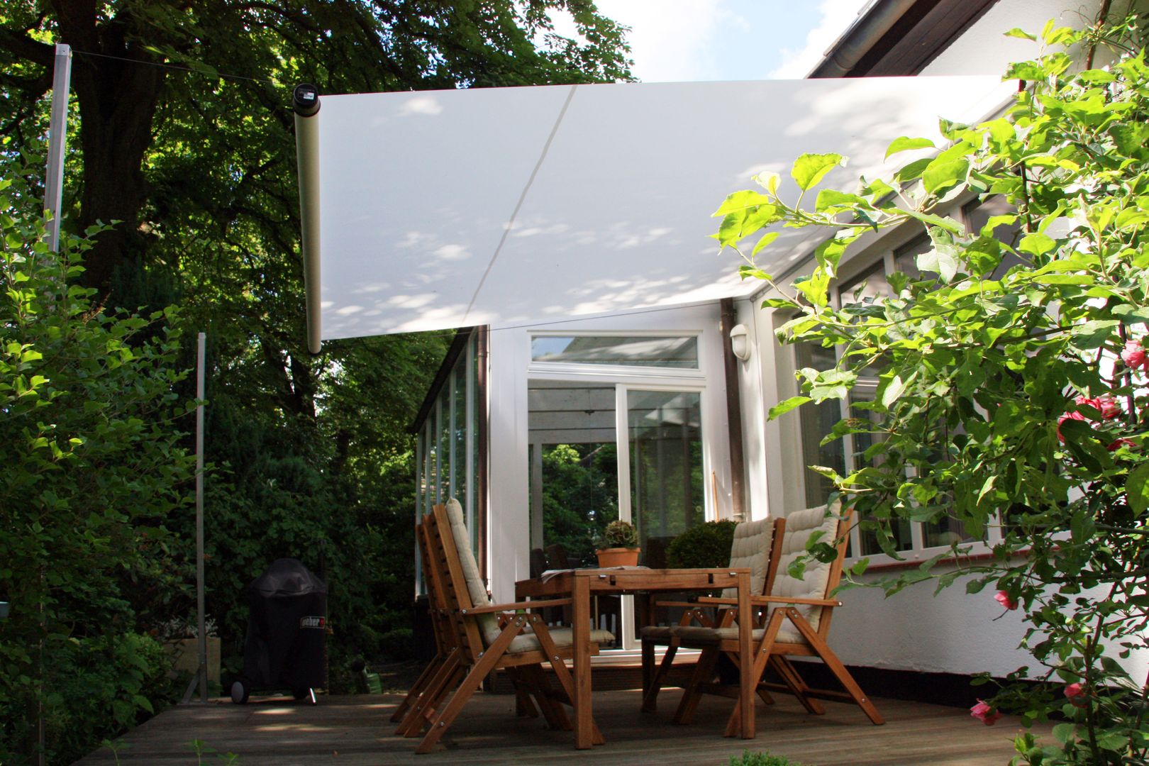 Sonnensegel müssen an mindestens drei Punkten befestigt werden und sind daher für kleine Balkone nicht geeignet. Dafür können diese Schattenwunder auch in den größten Gärten und Dachterrassen für schattige Plätzchen sorgen. Sonnensegel können bei Wind und Regen getrost im Freien bleiben. Einer Windgeschwindigkeit von bis zu 55 km/h halten sie problemlos stand. Diese Windgeschwindigkeit entspricht einem starken Windgang am Neusiedlersee.